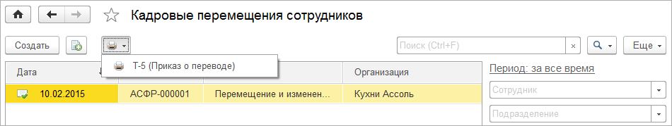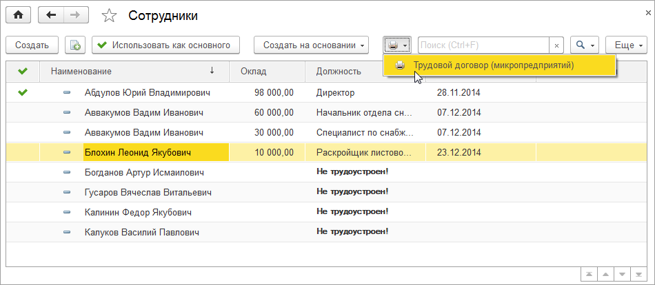 Форма доступна по кнопке Печать в справочнике Сотрудники (раздел Зарплата).