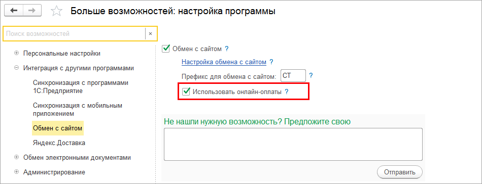 Включить использование автоматического формирования чеков при онлайн-оплате можно в настройках Обмена с сайтом (Компания - Еще больше возможностей - Интеграция с другими программами).