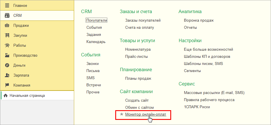Теперь в разделе CRM пользователю станет доступен Монитор онлайн-оплат. Запускать монитор онлайн-оплат может только пользователь с правами администратора.