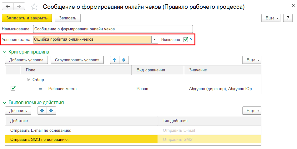 Пользователь может настроить автоматическое оповещение о сбое в работе обработки формирования чеков с помощью Рабочих процессов. Для этого условием старта необходимо указать Ошибка пробития онлайн-чеков.