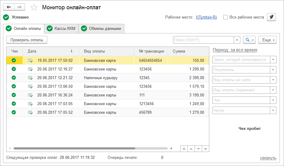 Важно! Для пробития онлайн-чека монитор онлайн-оплат должен быть открыт.