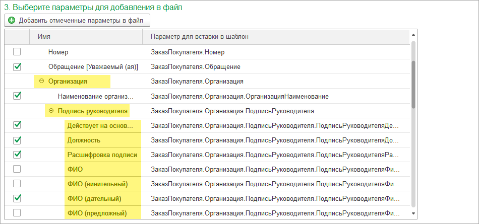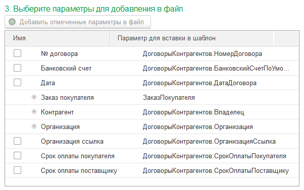3. Отметить флажками параметры для вставки. При печати документа, вместо параметров будут автоматически подставлены значения по данным учетной системы.