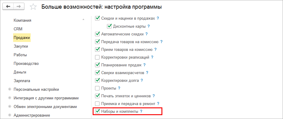 Чтобы начать работы с наборами в настройках раздела Продажи необходимо включить опцию Наборы и комплекты.