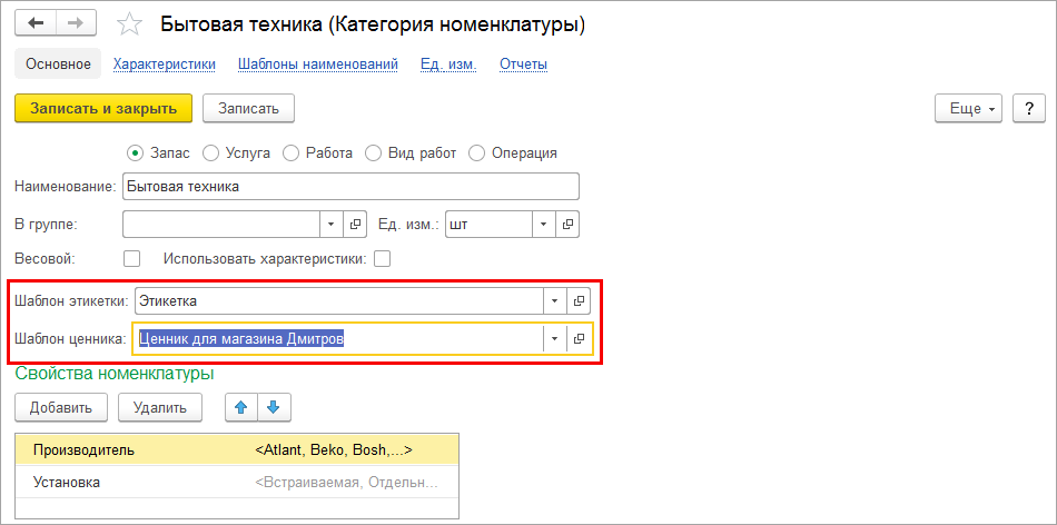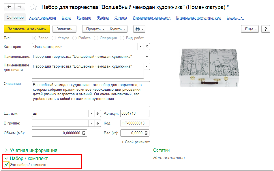 После включения функциональной опции в карточке номенклатуры появится группа Набор/комплект.