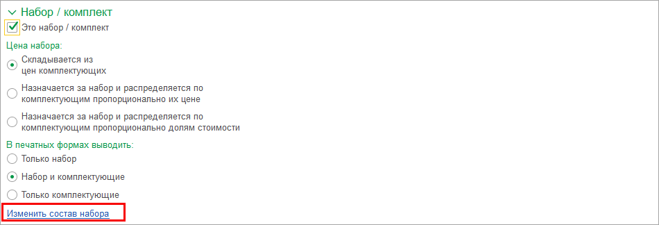 Необходимо установить флажок Это набор/комплект, после чего станут доступны настройки комплекта: Цена набора и отображение в печатных формах.