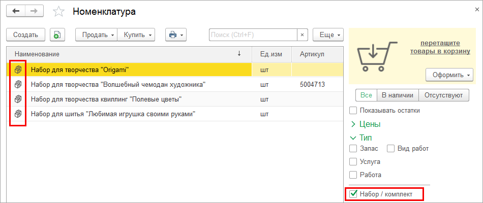 . Для удобства работы с наборами в список номенклатуры добавлен фильтр, при включении которого видны только наборы.