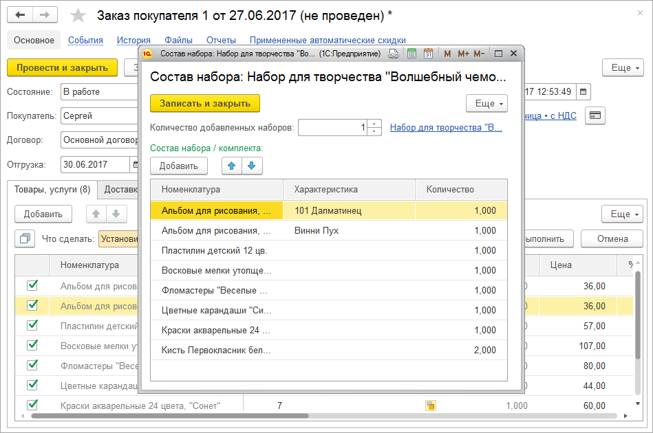 Набор/комплект в 1С:УНФ - это несколько различных товаров и услуг, объединенных в группу для удобного оформления операций продажи. Наборы будут полезны для всех, кто продает наборы товаров, например магазину цветов, косметики, подарков и другим.