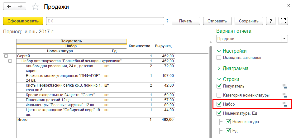 В отчет Продажи добавлена возможность отображения информации о проданных наборах. При добавлении в отчет группировки по наборам отображается количество проданных наборов.