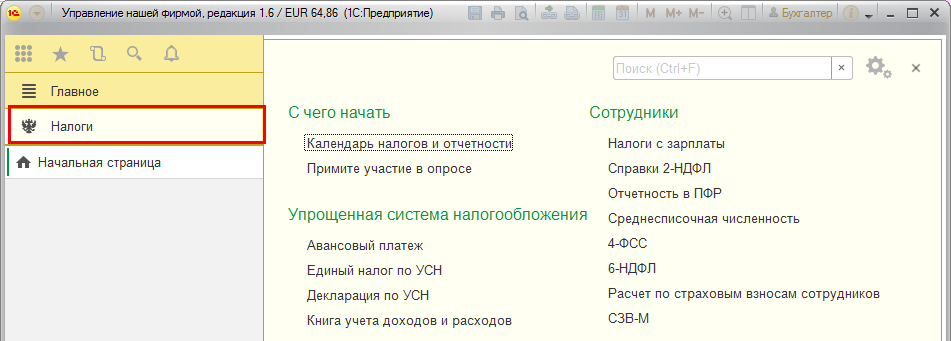 В программе появился новый профиль пользователя - Налоги. Данный профиль позволит пользователю работать с разделом Налоги, формировать и сдавать налоговую отчетность.