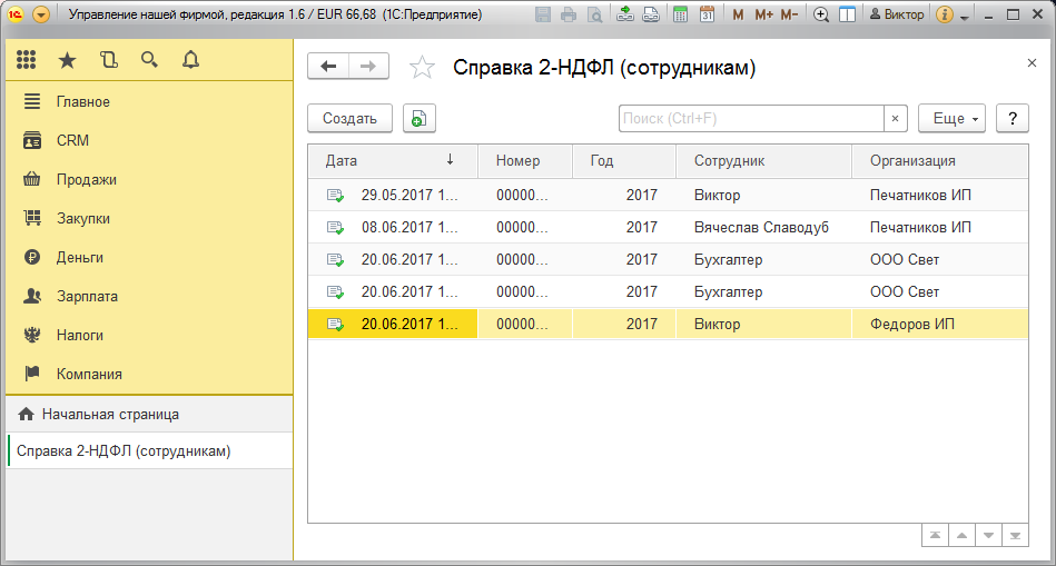 Просмотреть все ранее выданные справки можно в списке документов Справки 2-НДФЛ (сотрудникам) в разделе Налоги. Также из данной формы можно создать новую справку.