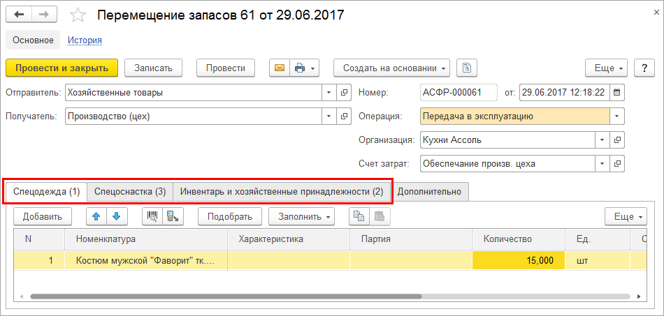 В документе Перемещения запасов с видом операции Передача в эксплуатацию и Возврат из эксплуатации добавлены табличные части Спецодежда и Спецоснастка.