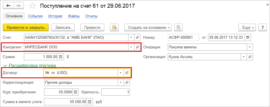 В документ Поступление на счет для вида операции Покупка валюты добавлены поля Контрагент и Договор. Поля отображаются и обязательны к заполнению в том случае, если настроен обмен с 1С:Бухгалтерия.