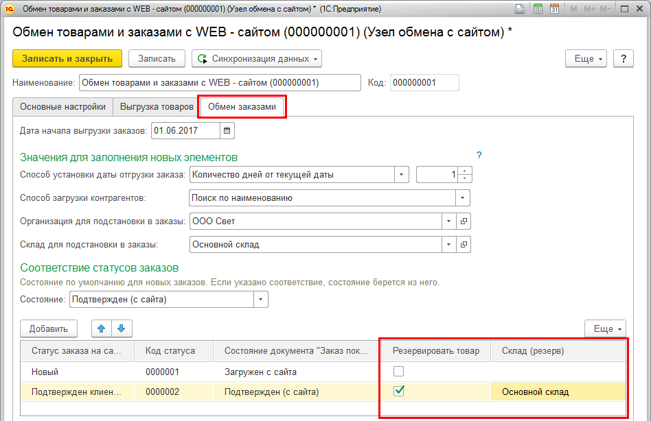 При загрузке заказа с сайта, если в заказе было установлено состояние, у которого в таблице настроек состояний указан флаг резервирования, будет заполнена колонка резерв равная количеству.