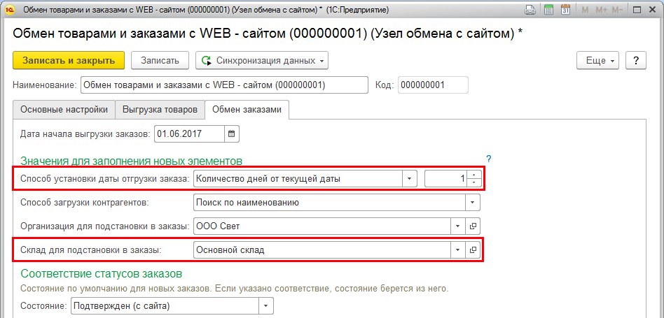 Также в настройки обмена с сайтом добавлены поля, на основании которых будут заполняться соответствующие реквизиты заказа при загрузке с сайта: