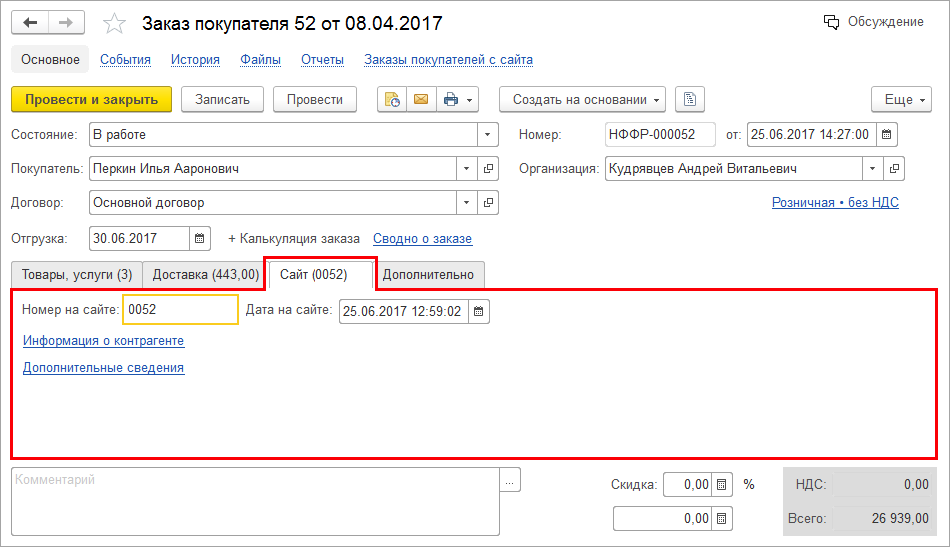 На данной закладке хранится информация о заказе из интернет-магазина: Номер и Дата заказа на сайте, гиперссылка Информация о контрагенте и Дополнительные сведения по заказу.