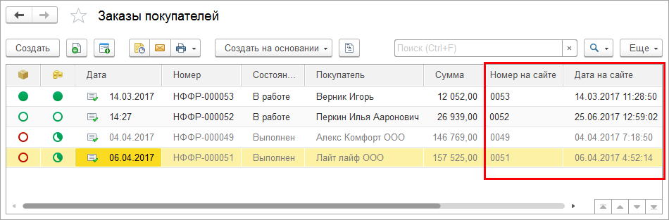 В список заказов добавлена колонка Номер на сайте. Для колонки Дата на сайте отключена пользовательская видимость (включить можно в меню Ещё - Изменить форму). Видимость колонок в списке зависит от опции Обмен с сайтом.