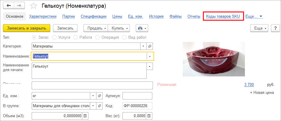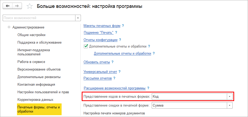 Для документов реализована возможность выбрать представление кода в печатных формах (например, счете, в ТОРГ-12, счете-фактуре и других).