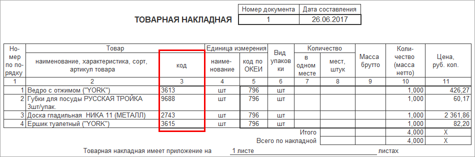 В печатной форме в колонку Код могут быть подставлены следующие значения:
