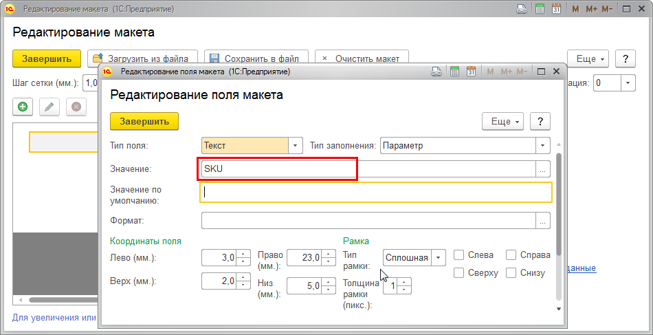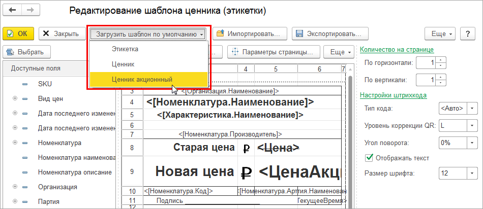 При создании макета ценника/этикетки код SKU будет доступен для выбора.