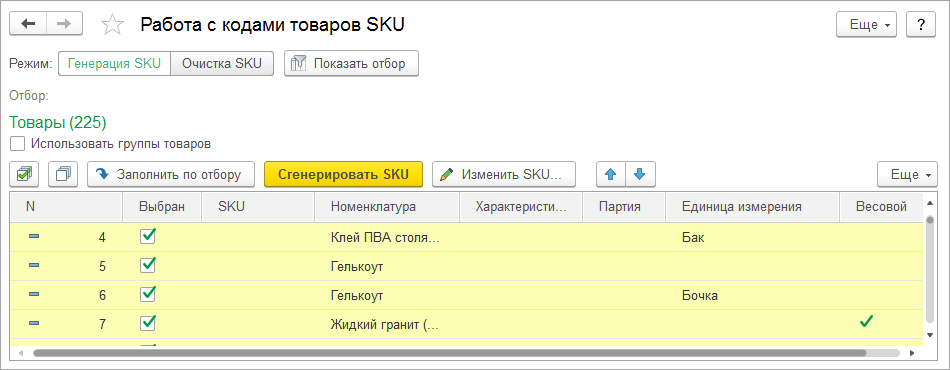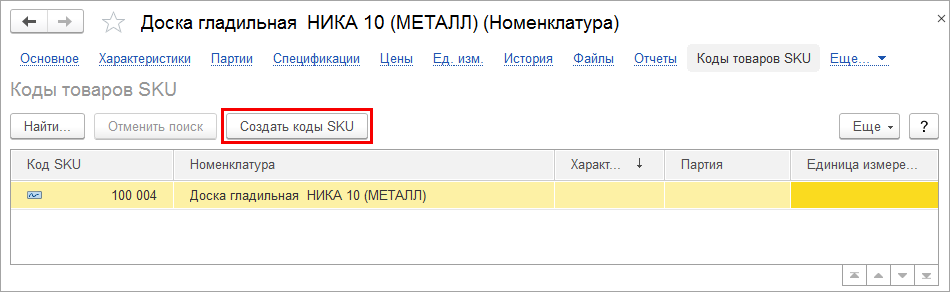 SKU коды присваиваются в разрезе Номенклатуры, Характеристики, Партии, Единицы измерения.