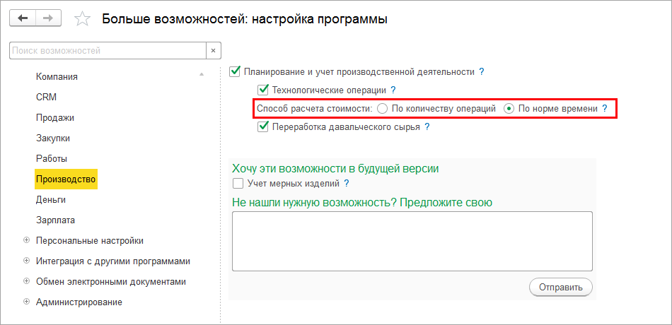 Включить расчет по нормам времени можно в настройках раздела Производство (Производство - Еще больше возможностей - Способ расчета стоимости).