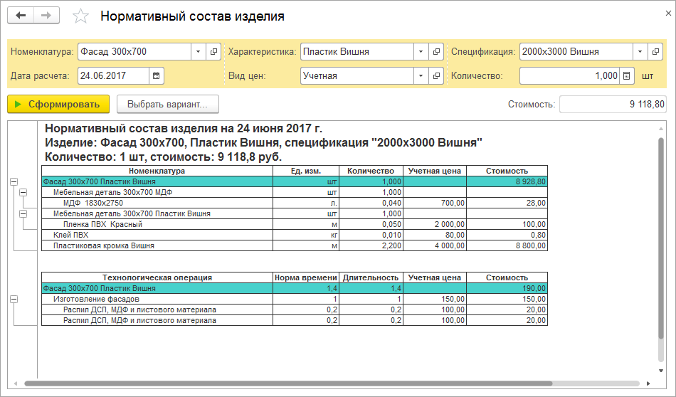 Расчет стоимости операций с учетом нормы времени пользователь может увидеть в отчете Нормативный состав изделия.