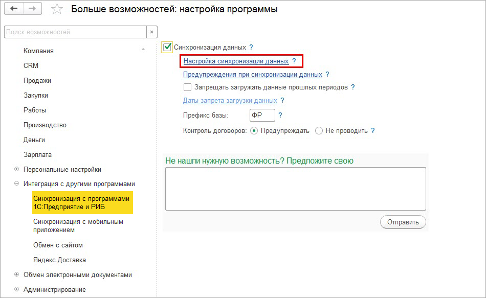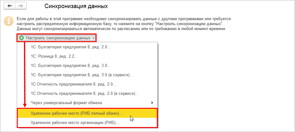 Настроить РИБ можно в разделе Компания - Интеграция с другими программами. В подразделе Синхронизация с программами 1С:Предприятие необходимо установить флажок Синхронизация данных, после чего станет доступна ссылка Настройка синхронизации данных.