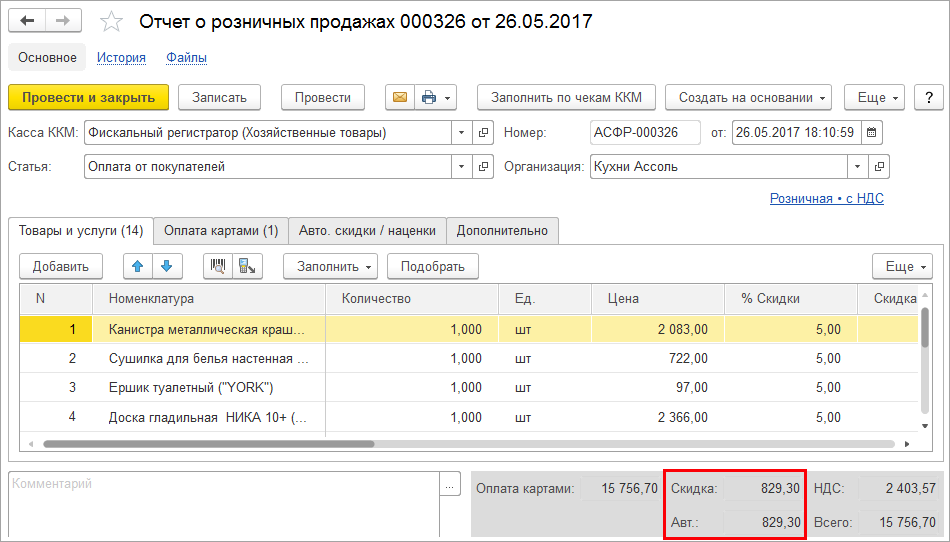 В новой версии 1С:УНФ в документ Отчет о розничных продажах добавлен вывод итогов по колонкам Скидка и Авт. (автоматическая скидка). Расчет итоговой суммы скидок позволит нам получить информацию о сумме скидок за смену.