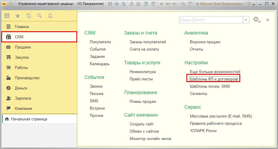 Открыть список шаблонов договоров теперь можно прямо из раздела CRM. Для этого необходимо перейти по ссылке Шаблоны КП и договоров.