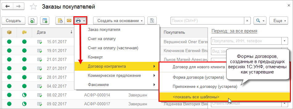 Формы договоров, созданные в предыдущих версиях 1С:УНФ, будут отмечены как устаревшие, к наименованию добавлена приписка (устарела).