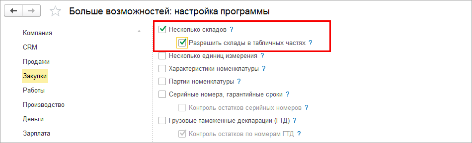 Для использования новой возможности в настройках раздела Закупки (Еще больше возможностей) необходимо установить опции Несколько складов и Разрешить склады в табличных частях.