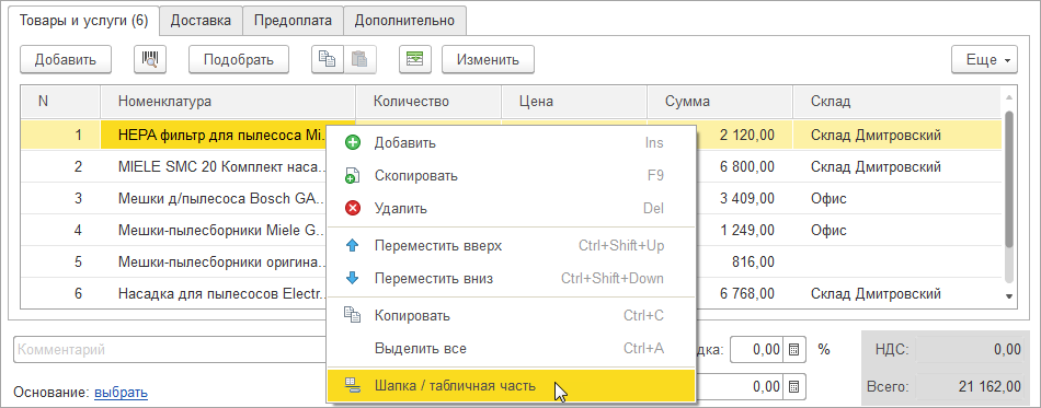 Настройку отображения склада можно открыть, вызвав правой кнопкой мыши контекстное меню и выбрав там пункт Шапка/табличная часть, или перейдя в меню Еще - Шапка/табличная часть.