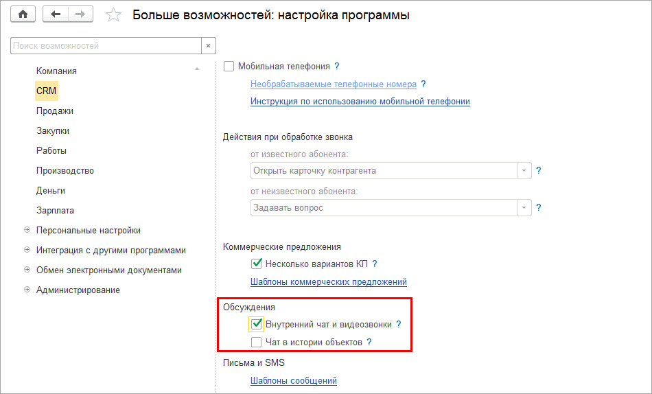 Включить использование обсуждений можно в настройках раздела CRM (CRM – Еще больше возможностей – Обсуждения).