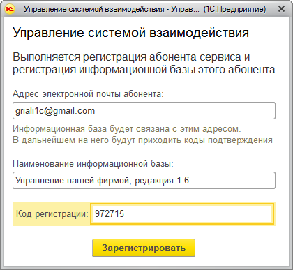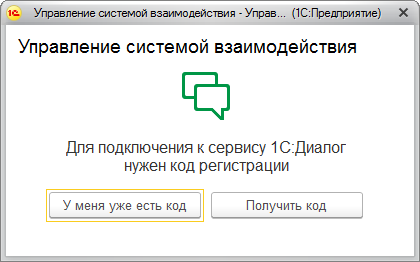 После установки флажка появится диалоговое окно, в котором пользователю будет предложено получить или ввести ранее полученный код регистрации в сервисе 1С:Диалог.