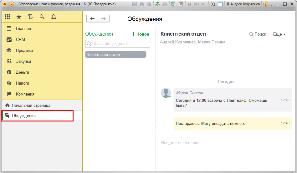 В форме Обсуждения, открытой из меню разделов, можно создавать чаты, не привязанные к конкретному объекту (элементу справочника или документу) и приглашать в них участников.