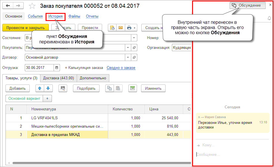 В контекстных обсуждениях (привязанных к элементу справочника или документу) также произошли некоторые изменения.