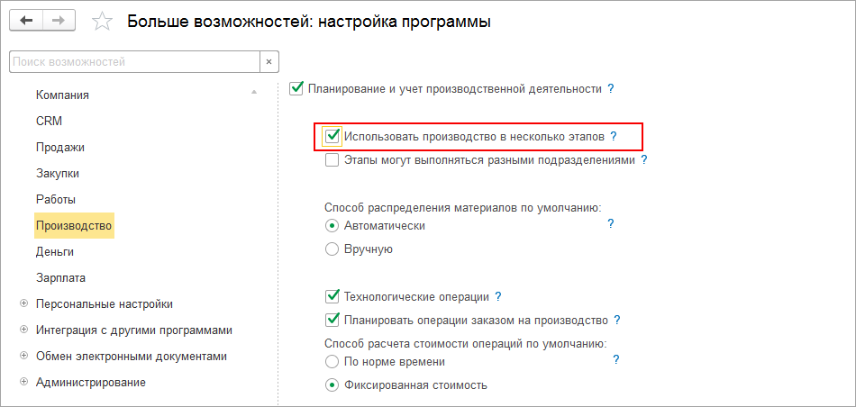Для использования поэтапного производства в настройках раздела Производство или Работы необходимо установить флажок Использовать производство в несколько этапов.
