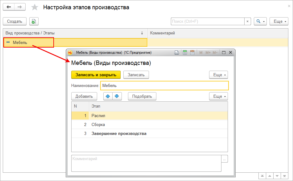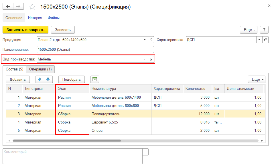 2. Для каждой спецификации необходимо задать порядок этапов. Для этого в карточке спецификации нужно заполнить реквизит Вид производства.