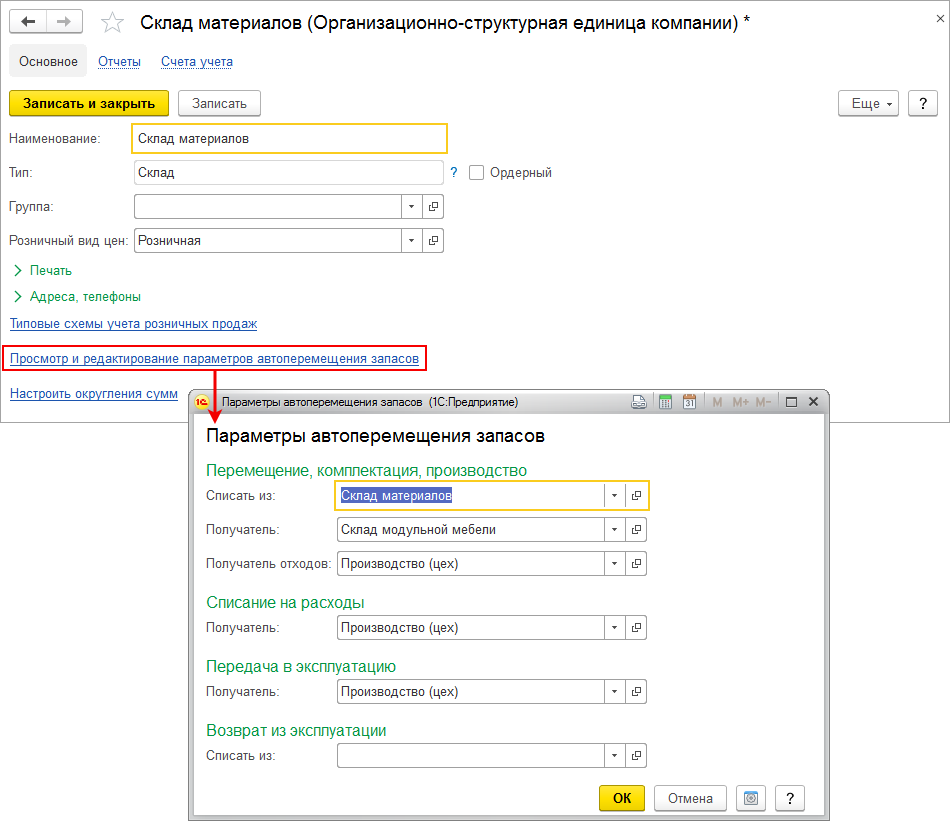 3. Склады списания материалов и хранения готовой продукции будут подставляться из настроек автоперемещения запасов. Параметры автоперемещения можно установить в карточке любого склада или подразделения.