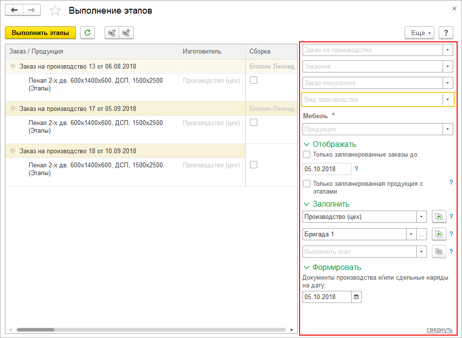 В результате работы автоматически формируются документы производства и сдельные наряды (если на этапе выполняется операция и указан исполнитель).