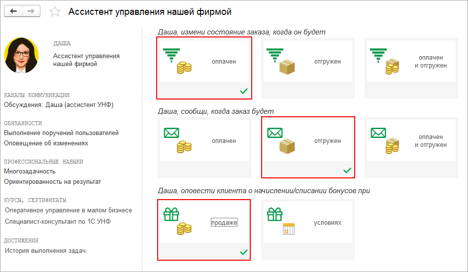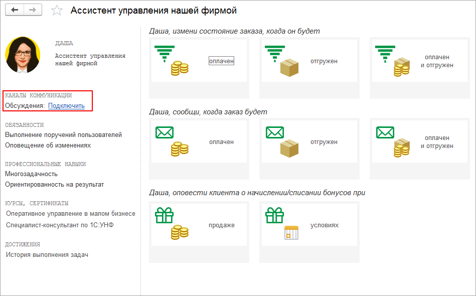 Даша, как и обычный сотрудник, выполняет поручения в 1С:УНФ. Например, можно поручить Даше обработку заказов при получении оплаты или отгрузке – она изменит состояние заказа, напишет об этом в чате документа и сообщит об изменениях менеджеру.