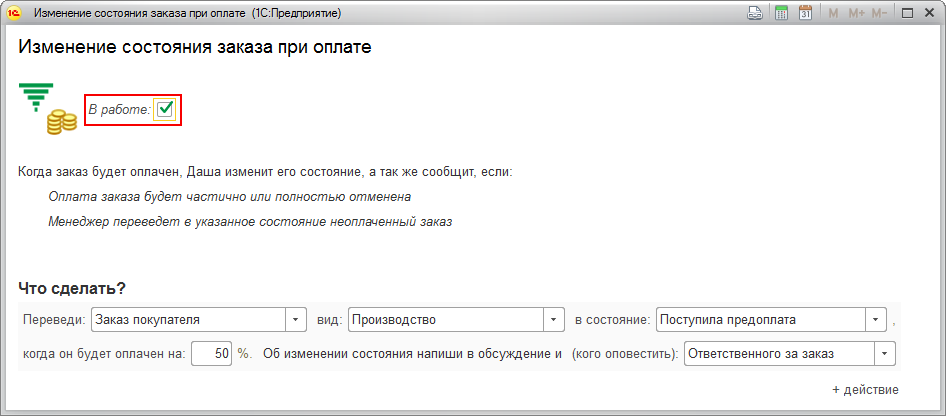 Далее необходимо задать порядок действий ассистента: выбрать тип документа, вид заказа и состояние, в которое он должен быть переведен при получении процента оплаты.
