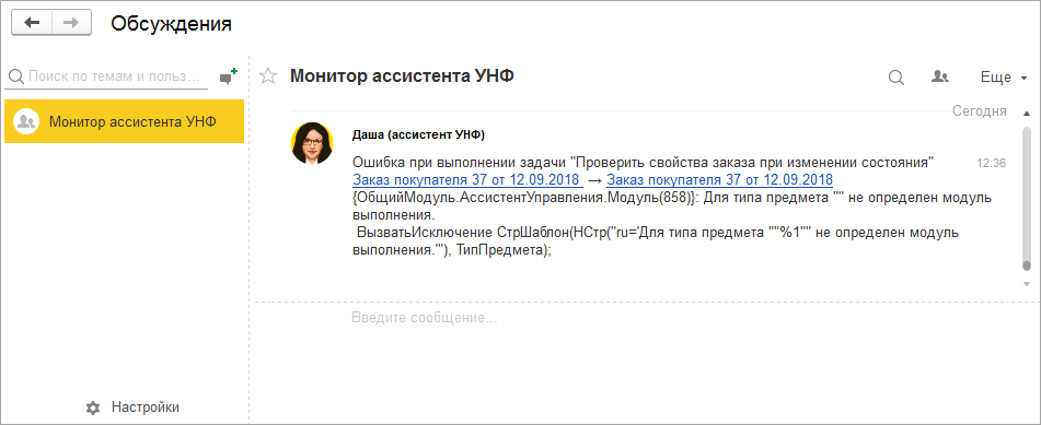 После подключения ассистента в программе будет создано общее обсуждение Монитор ассистента УНФ, в котором ассистент 1С:УНФ будет писать сообщения о возникающих в процессе работы ошибках.