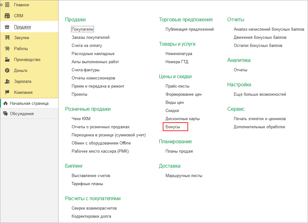 Настроить бонусную программу лояльности можно в разделе Продажи, подразделе Цены и скидки.