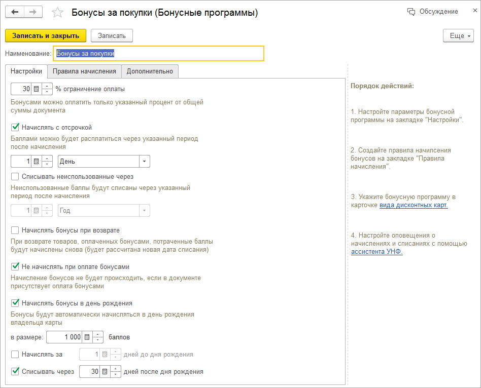 В 1С:УНФ появилась поддержка бонусных программ лояльности.