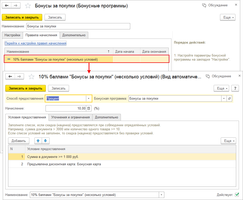 2. Создать правила начисления бонусов на закладке Правила начисления.