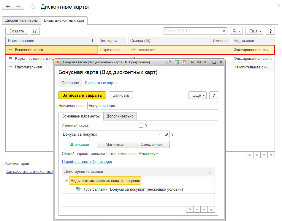 Зарегистрировать новую бонусную карту можно в справочнике Дисконтные карты, в разделе Продажи.