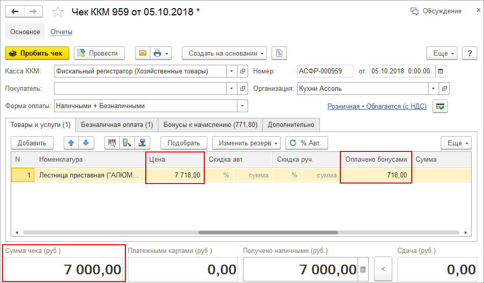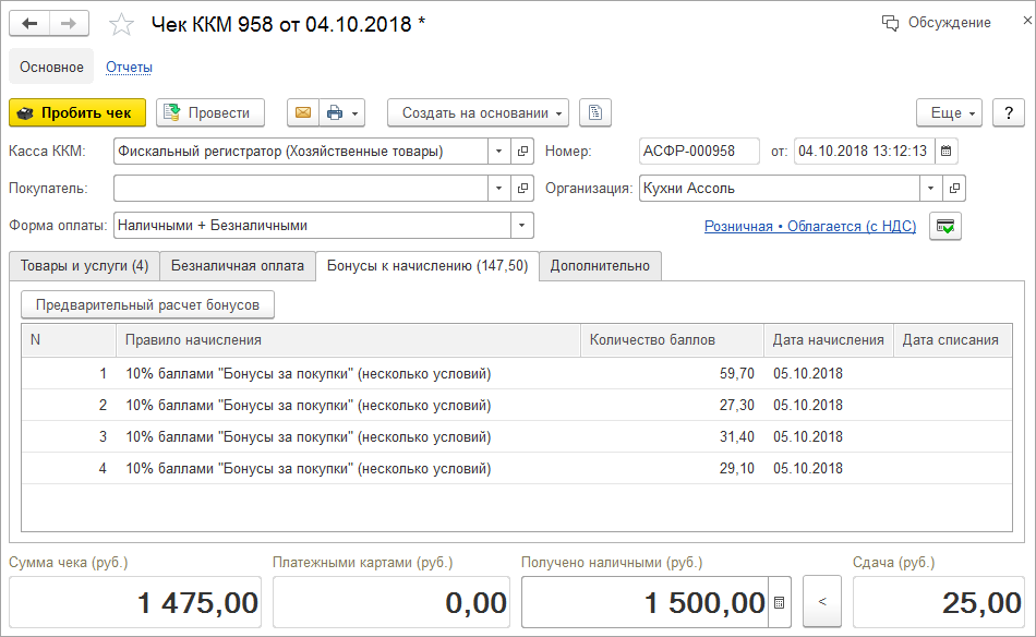 Бонусы начисляются клиенту при розничной продаже, если была предъявлена бонусная карта. Начисление бонусов происходит в момент пробития чека.