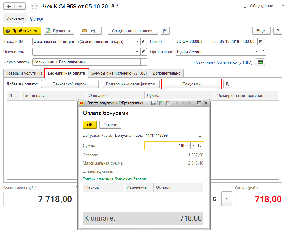 Оплата бонусами в документах указывается на вкладке Безналичная оплата.