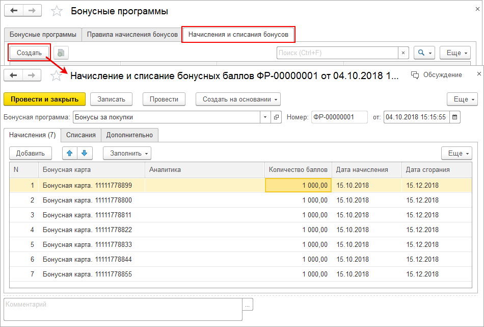 Если до начала работы в 1С:УНФ уже использовалась бонусная программа лояльности, начисленные ранее бонусы также можно отразить с помощью документа Начисление и списание бонусных баллов.